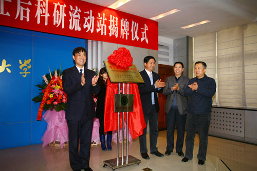 亢保民处长、张有乾副处长,校领导刘德安、苏三庆、马宏伟、李树刚为我校获准增设和新设的博士后科研流动站揭牌。
